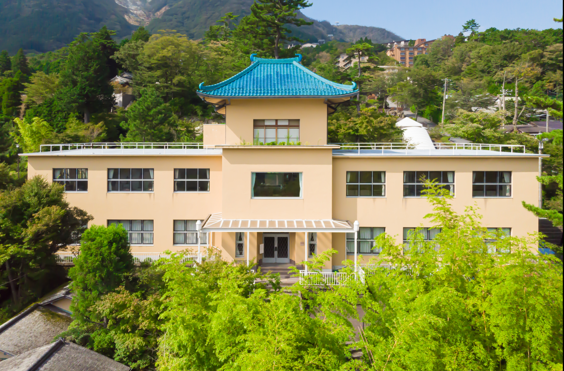 The blue-tiled roof is in a quasi-Chinese design, and the large window on the upper floor commands a panoramic view over the Shinsenkyō garden and the Hakone calderas.