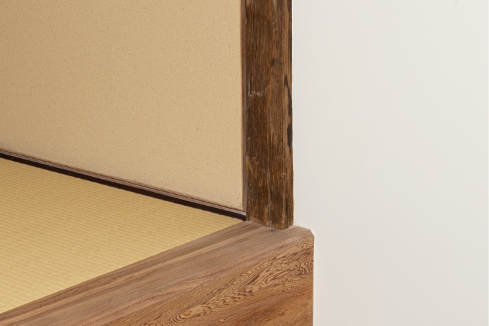 框には、野性味のある木目が美しい樹齢1000年の貴重な屋久杉を用い、両脇の柱には、向かって右に奈良の海龍王寺(創建8世紀前半)、左に當麻寺(創建 伝612年)の天平古材と呼ばれる古い材木が使用されています。壁は聚楽土を塗り込めた土壁となっています。