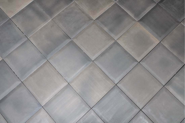瓦を斜めにして床に配する四半敷きという敷き方で、ブリッジの端に瓦の角がきれいに合うように寸法を決めて作成しています。完璧な割付によって生じる緊張感と、瓦を焼く手仕事の柔らかさが共存しています。