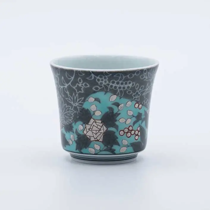 Guinomi-style sake cup with flora pattern in sumihajiki overglaze