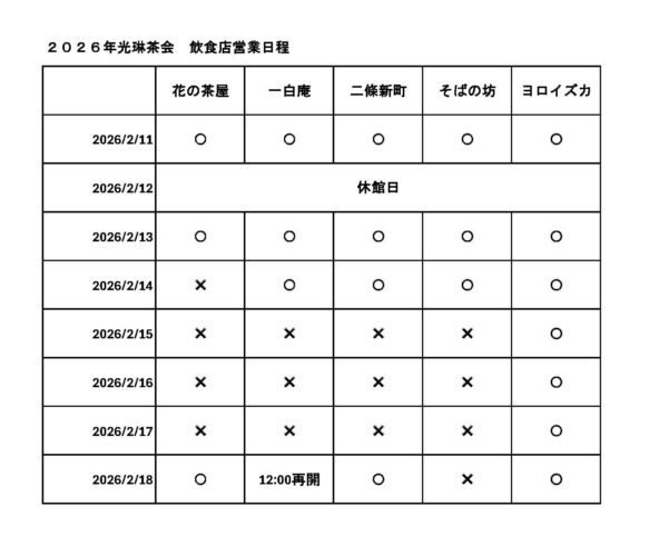 Due to an event being held in the "Tea Garden" (Cha-no-Niwa) area, several dining facilities will be temporarily closed, and entry to the garden will be restricted from Saturday, February 14 to Tuesday, February 17.