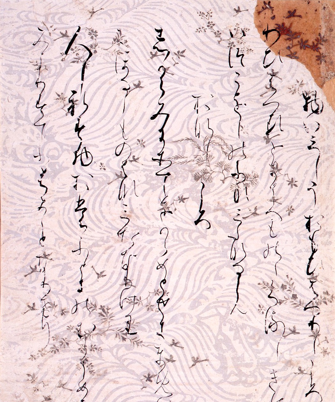 西本願寺伝来「伊勢集」の断簡で、弾力的で太く細く、リズミカルに料紙の上を走る筆跡の古筆切です。料紙は波模様の唐紙に蝶、鳥に草木を散らし、右方に破り継ぎがあり、料紙装飾の粋が凝らされています。