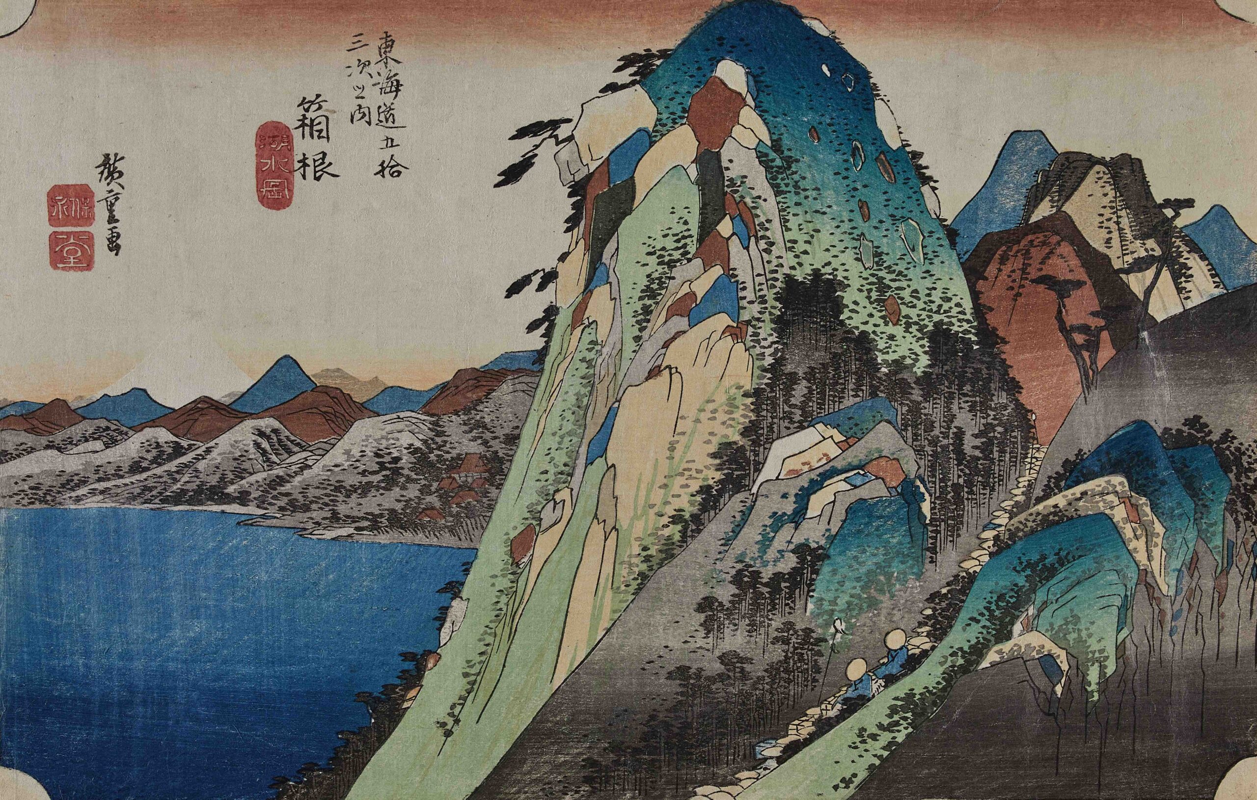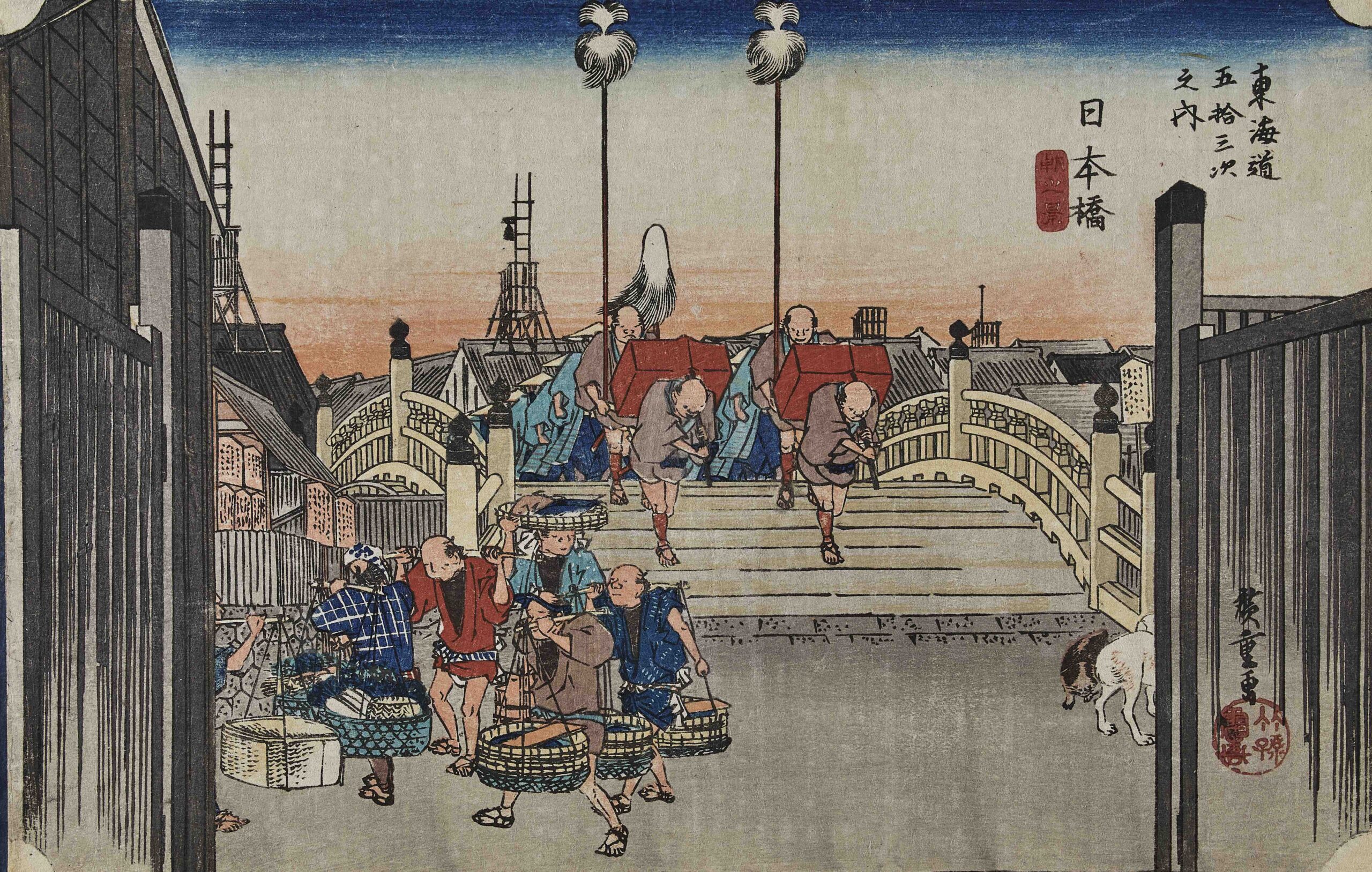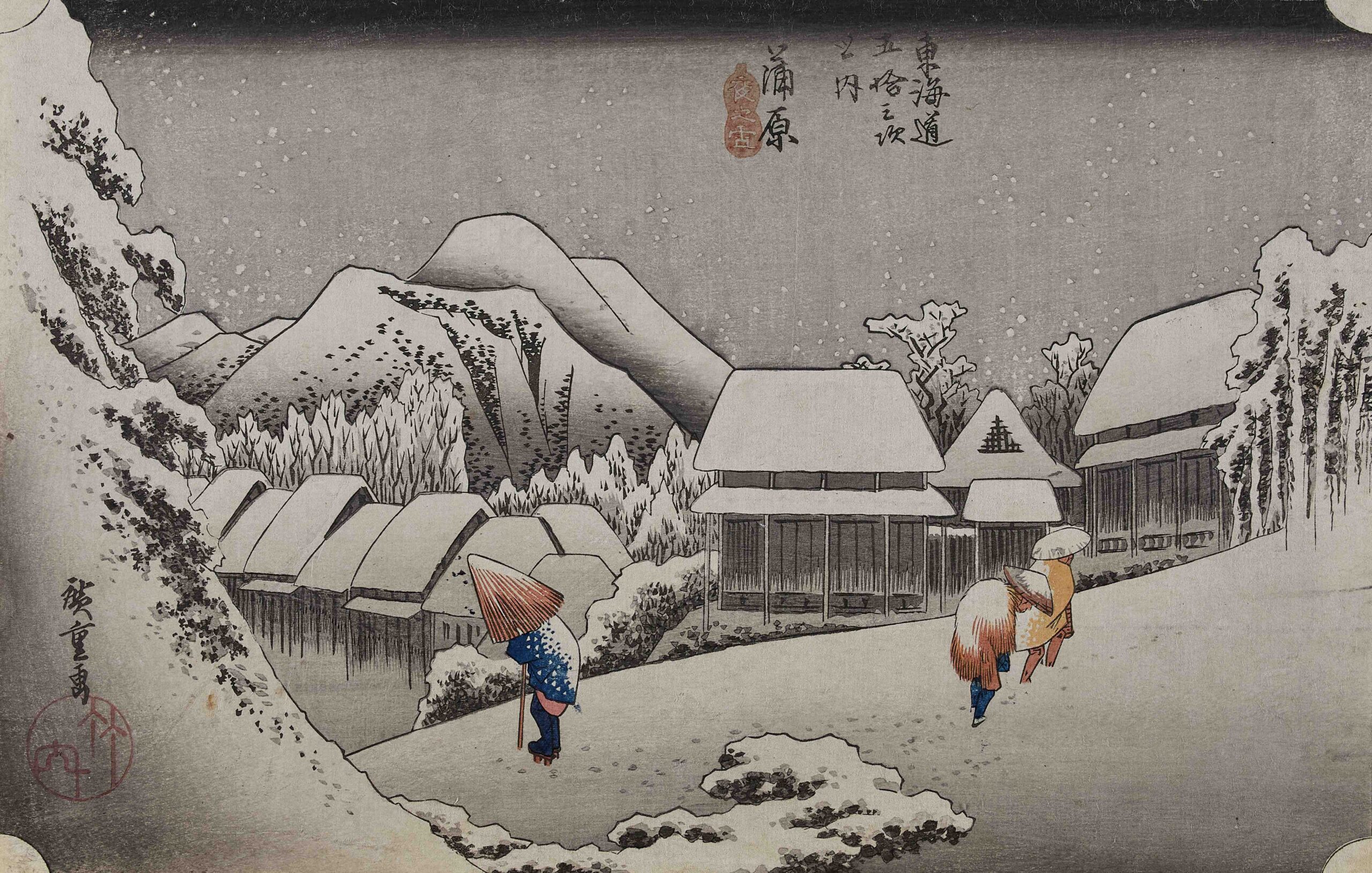 歌川広重(1797~1858)による保永堂版「東海道五十三次」には、江戸日本橋から京都に至る旅の情景が、四季や天候、時刻の変化など自然の移り変わりと共に描かれています。江戸時代後期の旅行ブームを背景に大人気を博し、広重の出世作となった作品です。