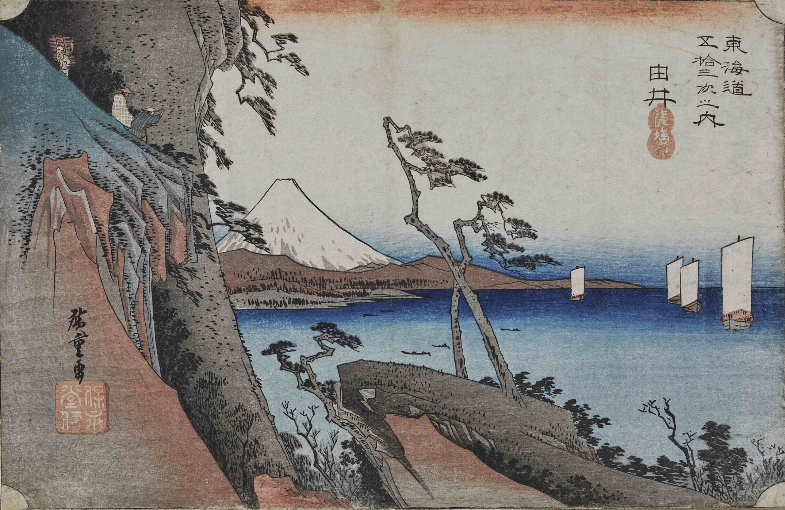 歌川広重(1797~1858)による保永堂版「東海道五十三次」には、江戸日本橋から京都に至る旅の情景が、四季や天候、時刻の変化など自然の移り変わりと共に描かれています。江戸時代後期の旅行ブームを背景に大人気を博し、広重の出世作となった作品です。