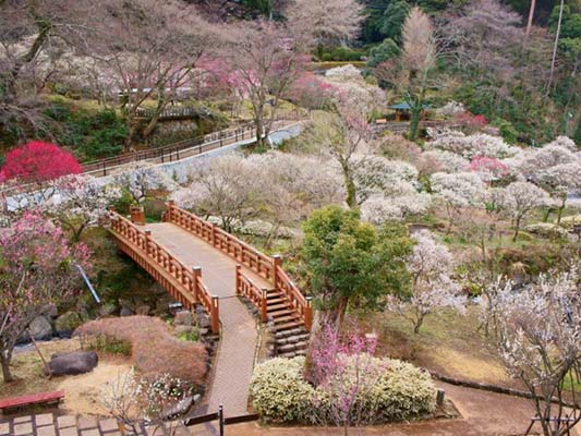 明治19年(1886)に当時湯治場として栄えていた熱海の町の、新たな行楽スポットとして開園しました。山あい約1万坪の土地を開拓して植えられた梅は、毎年11月下旬~12月上旬に第一号が開花する日本で最も早咲きの梅として知られています。毎年1月から3月にかけては「熱海梅園梅まつり」が開催され、多くの観光客でにぎわっています。