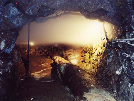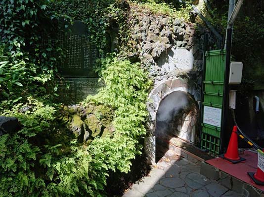 伊豆山神社から100段以上ある階段を下り、浜辺近くにある奥行5mの洞窟です。山岳信仰の開祖である役小角(634-701)が伊豆に島流しされた折に開拓したと伝わっています。湯が走るように湧き出して海にそそぐさまから、のちに「走湯」と名付けられ、諸々の罪もきえる霊湯(走湯権現)として伊豆山神社の信仰と結びつきました。