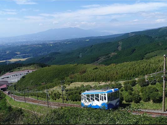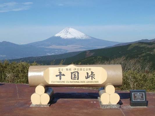 熱海の北、箱根外輪山へと続く峠で、国の登録記念物に指定されています。かつて「十の国(伊豆、相模、駿河、遠江、甲斐、安房、上総、下総、武蔵、信濃)と五島(大島・新島・神津島・三宅島・利島)」を見渡せたことが地名の由来といわれています。現在は中腹から山頂へケーブルカーが通っており、富士山をふくむ360°の眺望を楽しむことができます。