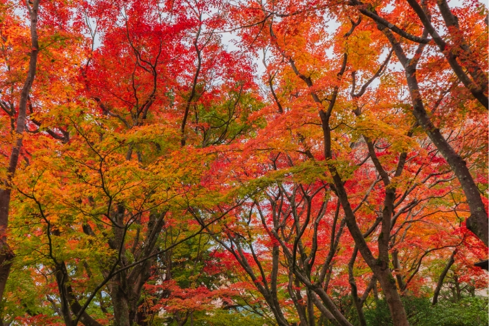 茶の庭では、ススキ、リンドウ、ホトトギス、ハギなどの秋草が見られます。 赤や黄色の紅葉を愛でながら、茶室一白庵でお抹茶を楽しむことができます。