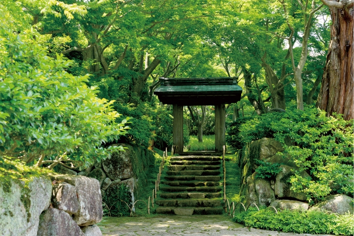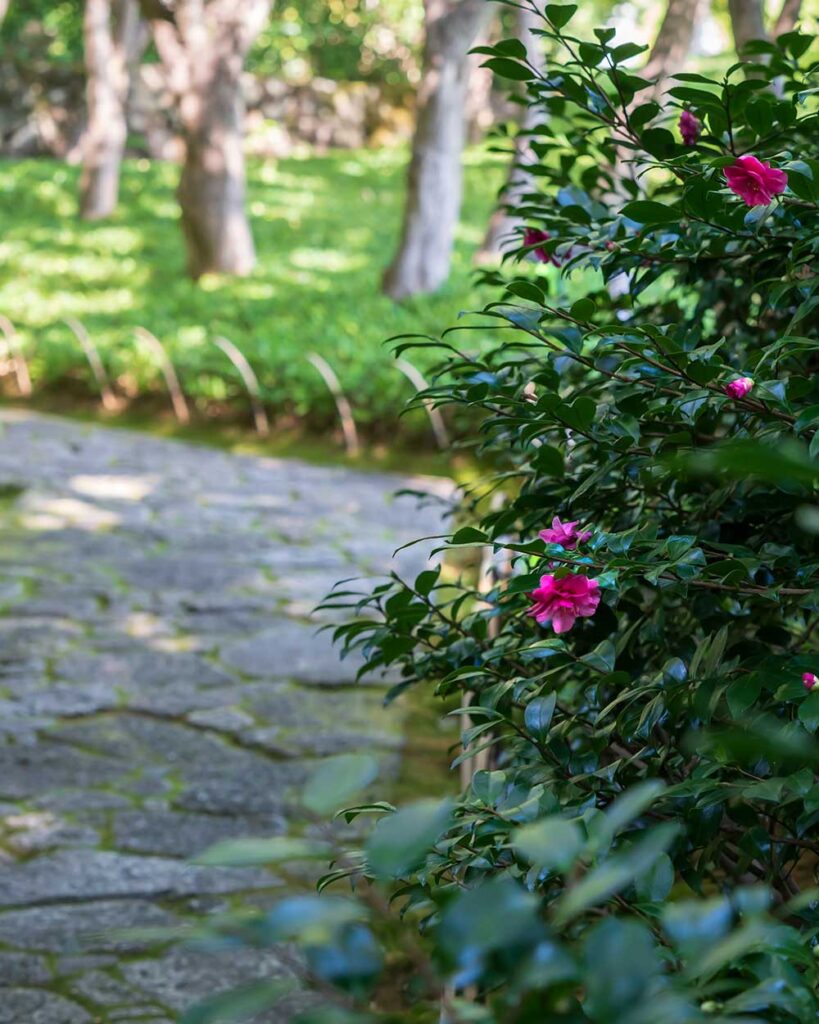 茶の庭に向かう路地には苔が生し、馬酔木、熊笹、モミジなど緑が溢れています。