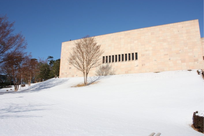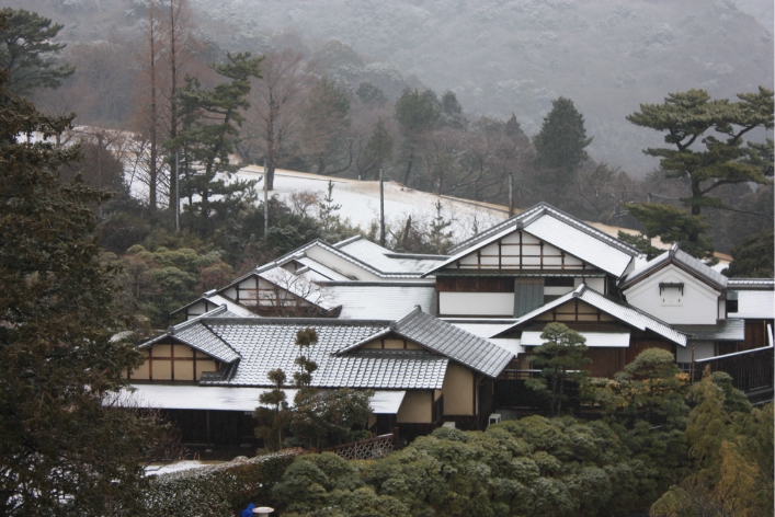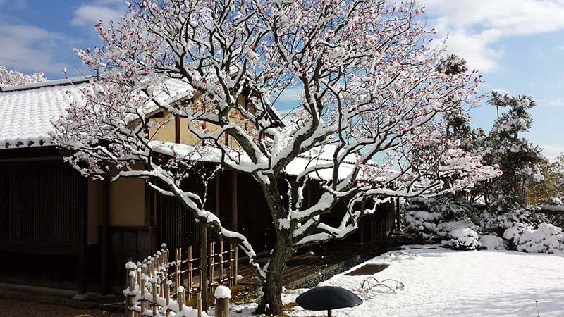 温暖な熱海でも標高300メートルに位置するMOA美術館では稀に雪景色が見られます。茶室や梅の木に雪が降り積もり、一面銀世界となります。